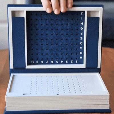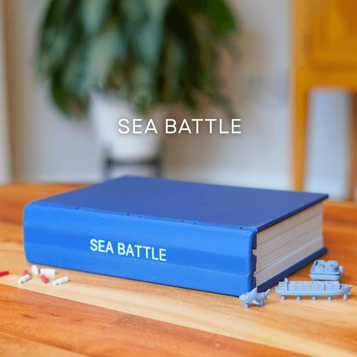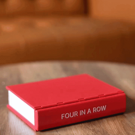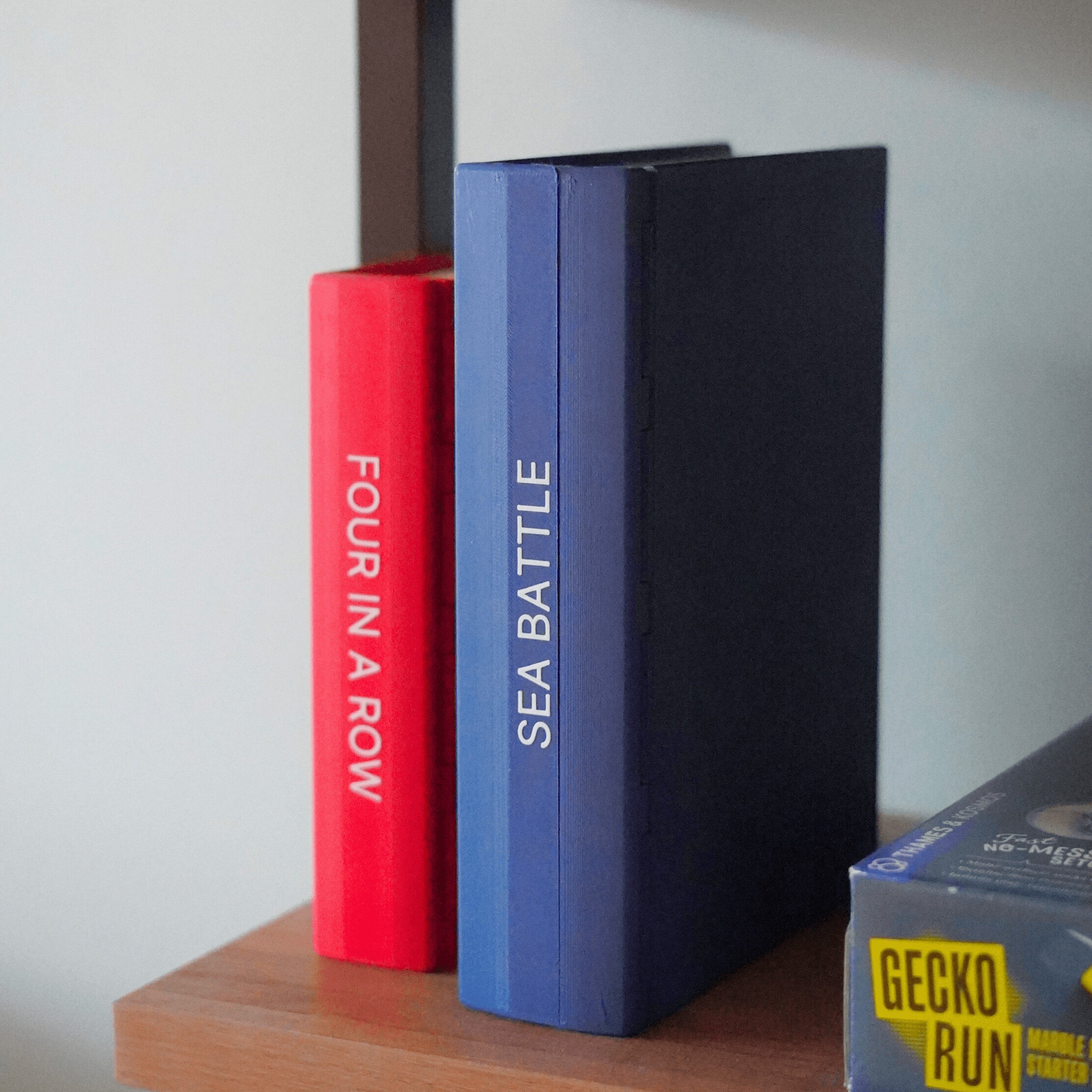 Looks like a stylish decor book on shelves; splits open to reveal full-sized game boards for both Four in a Row and Sea Battle.